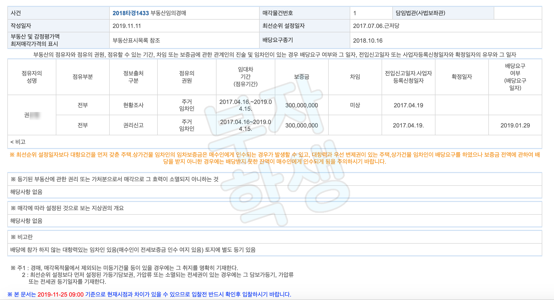 4) 매각 물건 명세서에는 임차인의 이름, 보증금, 전입신고, 확정일자, 배당요구일, 그리고 낙찰자가 인수해야 하거나 특수 권리들이 기재되어있다.