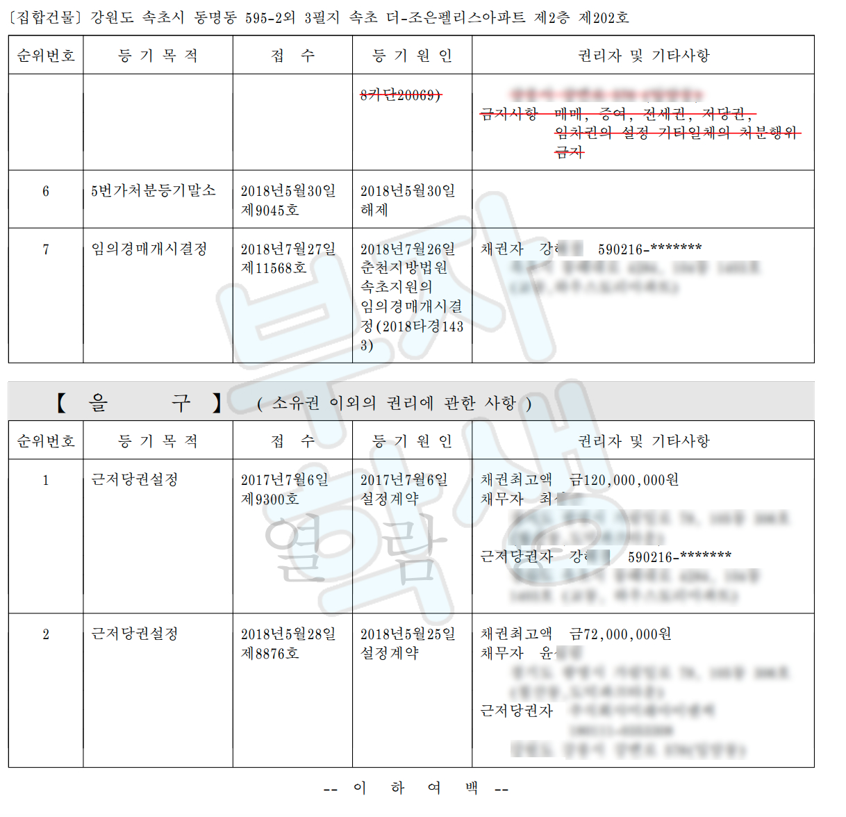 이 부동산에는 2017년 7월 6일, 2018년 5월 28일에 설정된 2개의 근저당권이 등기되어있네요.