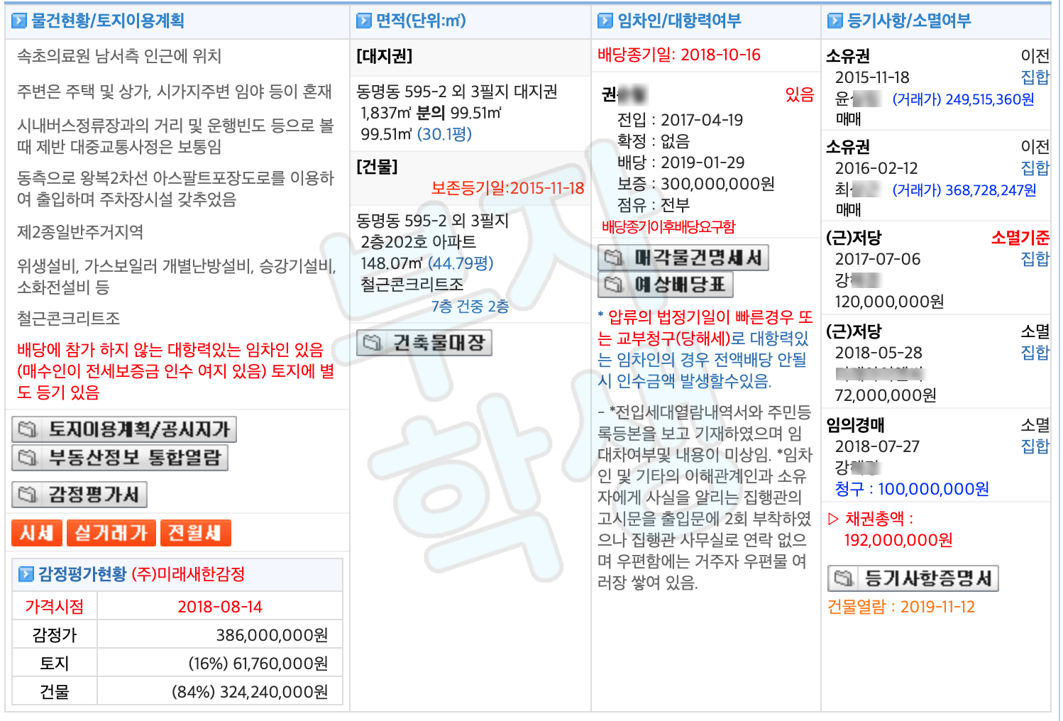 1) 경매 물건의 권리와 임차인에 대한 정보는 등기부 등본과 매각 물건 명세서에 기재되어 있다.